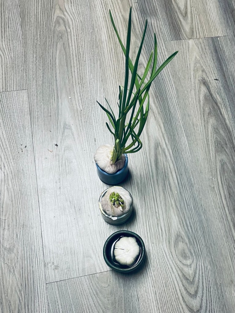 Take one whole garlic bulb (don’t separate the cloves). Put it root side down on the rim of a small cup or shot glass so the bottom just touches the water. Add water until it barely touches the bottom of the garlic — do NOT submerge it. Place by a bright window. Change the water every 2–3 days to avoid mold.